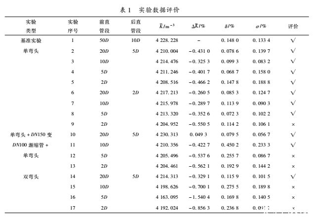 表1給出了17組實驗的數據記錄,認為平均儀表系數相對誤差和線性度均小于0.5%,同時不確定度小于0.17%時,安裝合適,進而給出安裝使用渦輪流量計的建議。其中“√”表示安裝的前后直管段合適;“×”表示安裝的前后直管段不合適,上游阻流件對渦輪流量計的影響不能忽略。