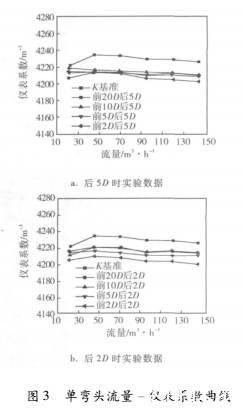 圖3為單彎頭流量-儀表系數曲線。